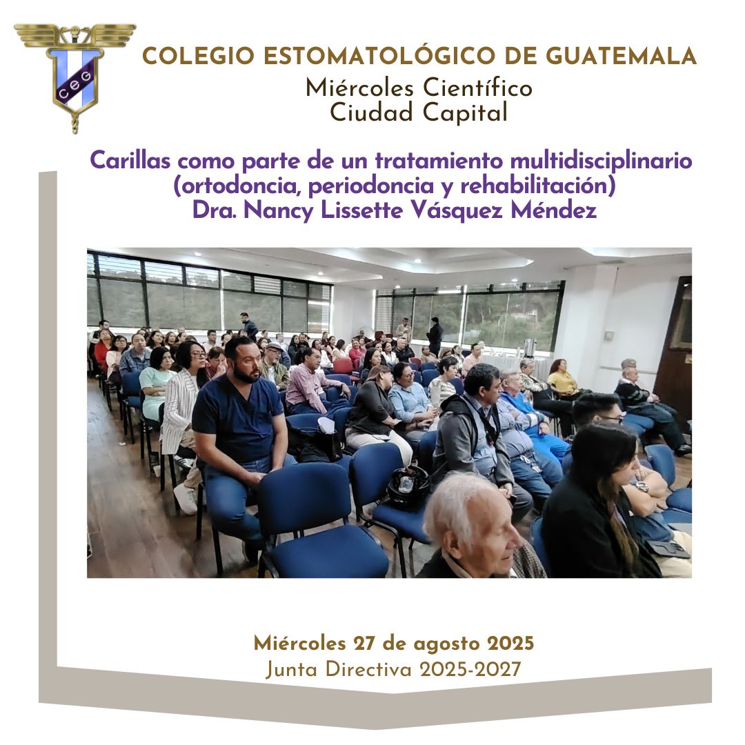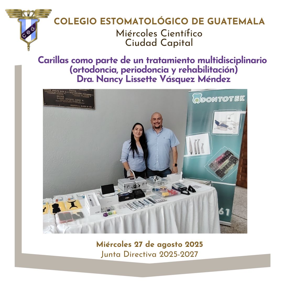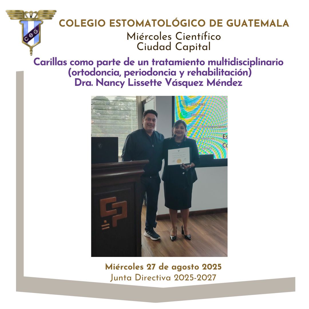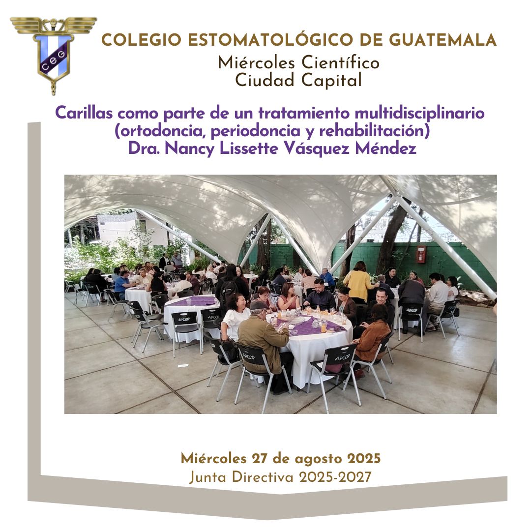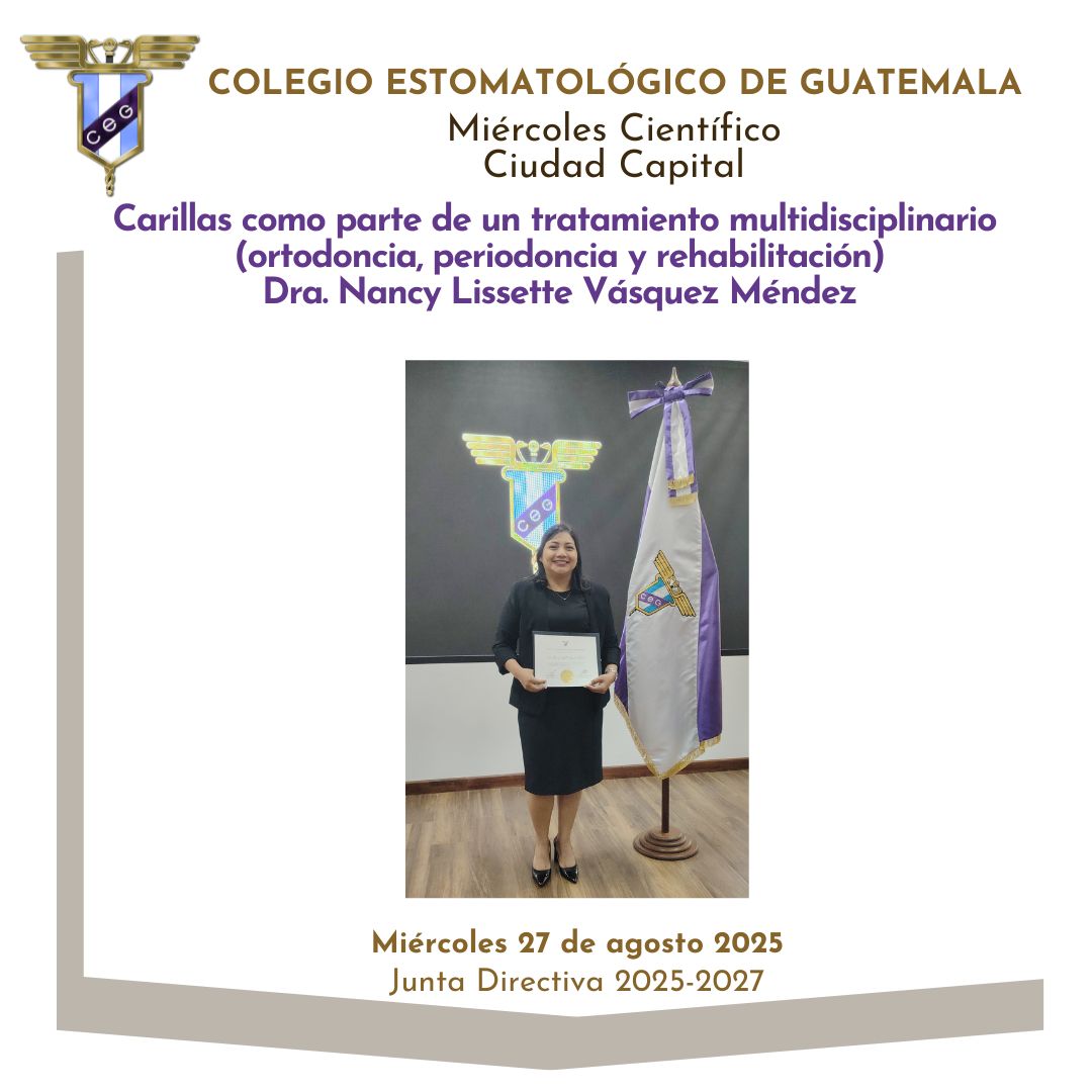 📌La Junta Directiva 2025-2027 del Colegio Estomatológico de Guatemala invita a participar en el evento Miércoles Científico con el tema “Carillas como parte de un tratamiento multidisciplinario (ortodoncia, periodoncia y rehabilitación)” impartido por Dra. Nancy Lissette Vásquez Méndez.